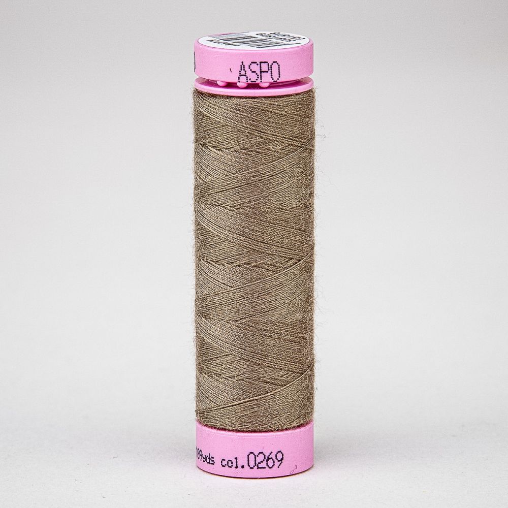 Univerzální hobby nit značky Amann z řady ASPO 120 v hnědé nazelenalé barvě. Polyesterové nitě z řady ASPO o síle 120 jsou univerzální šicí nitě pro domácnost, vyráběné v ČR. Jsou vhodné pro ruční i strojové šití všech druhů textilních materiálů z přírodních, směsových a plně syntetických vláken. Na úplety je doporučeno použít strečovou jehlu. Nitě ASPO jsou vysoce pevné - cca 990 CN, tažnost 12 %. Nitě mají přírodní vzhled, jsou odolné vůči oděru, bakteriím i plísním, jsou stálobarevné na světle a nesráží se při praní. Doporučená síla jehly je 70-90.