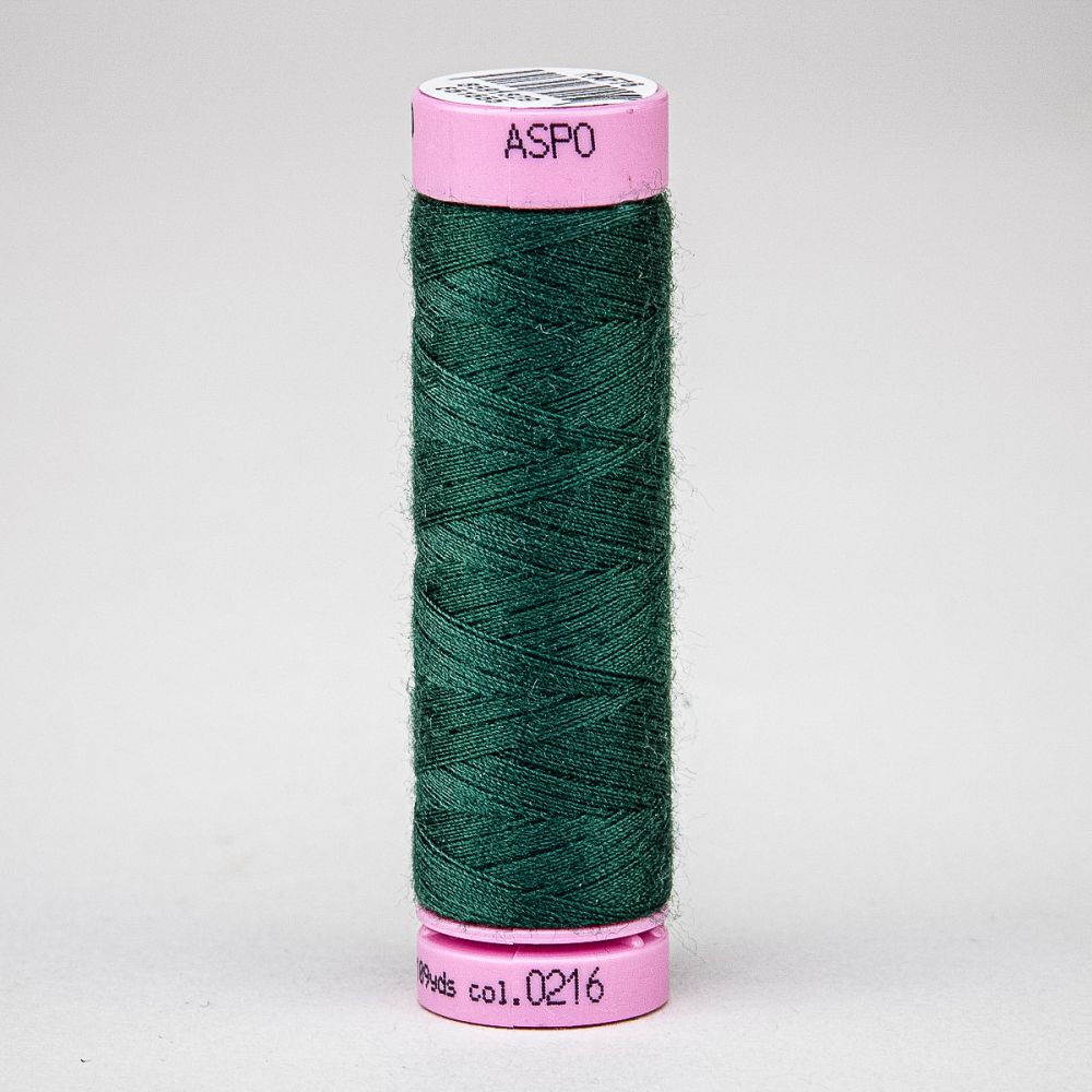 Univerzální hobby nit značky Amann z řady ASPO 120 v tmavě zelené barvě. Polyesterové nitě z řady ASPO o síle 120 jsou univerzální šicí nitě pro domácnost, vyráběné v ČR. Jsou vhodné pro ruční i strojové šití všech druhů textilních materiálů z přírodních, směsových a plně syntetických vláken. Na úplety je doporučeno použít strečovou jehlu. Nitě ASPO jsou vysoce pevné - cca 990 CN, tažnost 12 %. Nitě mají přírodní vzhled, jsou odolné vůči oděru, bakteriím i plísním, jsou stálobarevné na světle a nesráží se při praní. Doporučená síla jehly je 70-90.