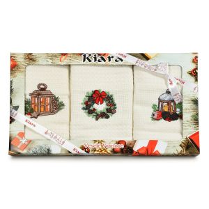 Utěrka KIARA VÁNOCE 18 vaflová vyšívaná, dárkové balení, hrníček a perníčky na bílé, 1 kus 50x70cm