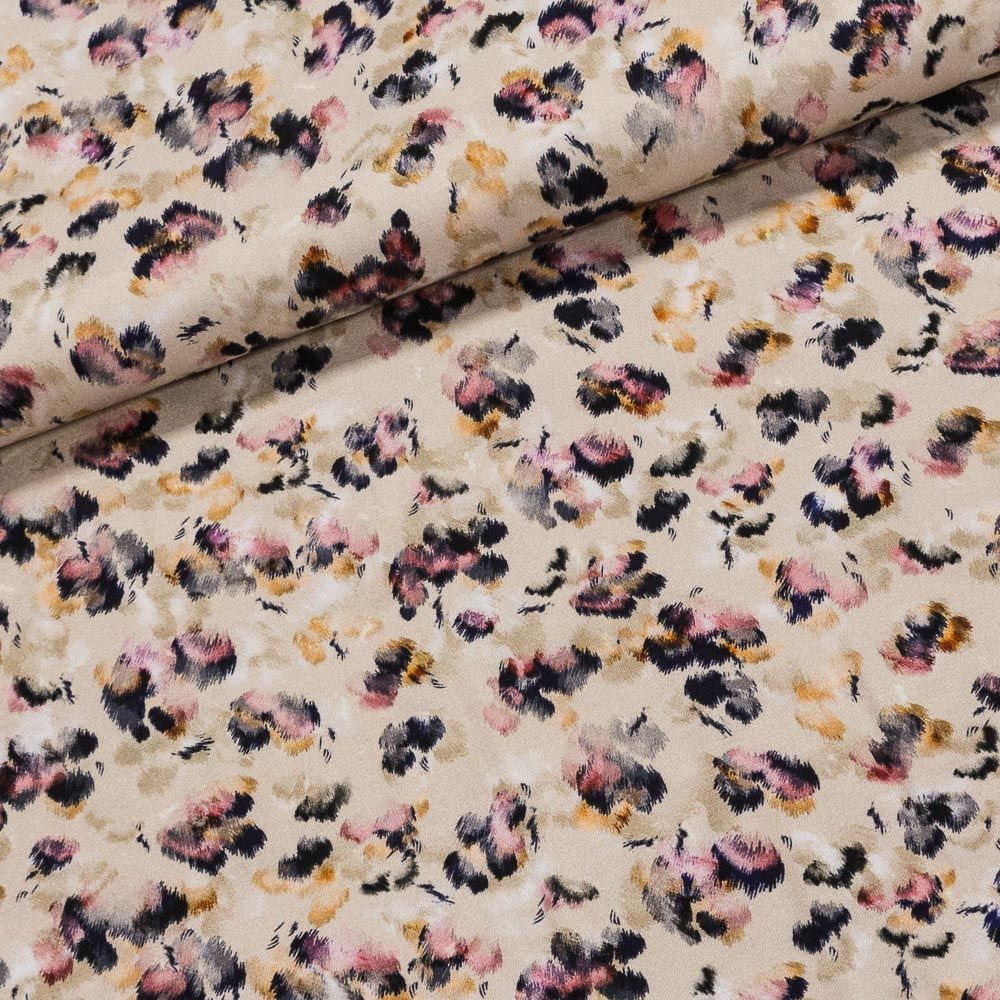 Elastický viskózový úplet (jersey) se vzorem šedých, růžových a žlutých skvrn na béžovém pozadí. Látka je v šířce 140 cm, vyrobena z 95% viskózy a 5% elastanu (gramáž 200g/m2) je vhodný zejména na výrobu šatů, elasťáků, kardiiganů či topů a halen. Vzor látky je jen z jedné strany z druhé strany je bez potisku.