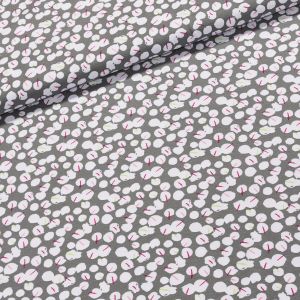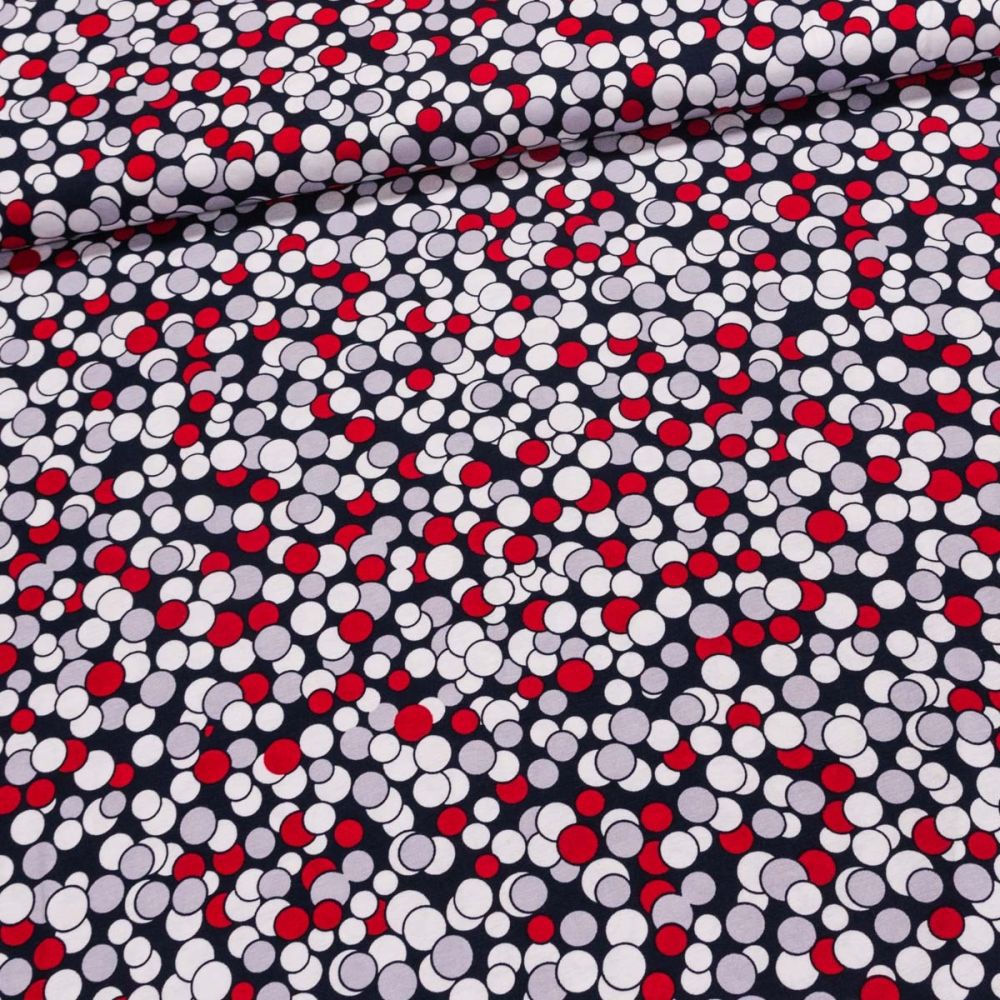 Elastický viskózový úplet (jersey) se vzorem červeno-bílo-světle-fialových puntíků na černém podkladu. Látka je v šířce 150 cm, vyrobena z 96% viskózy a 4% elastanu (gramáž 200g/m2) a je vhodná na výrobu šatů, topů, sukní, kardiganů a kostýmků. Látka má vzor jen z jedné strany, z druhé strany je bez potisku.