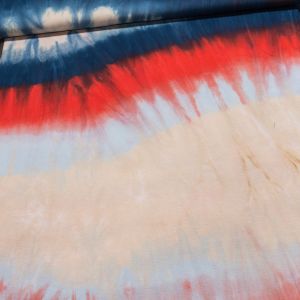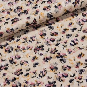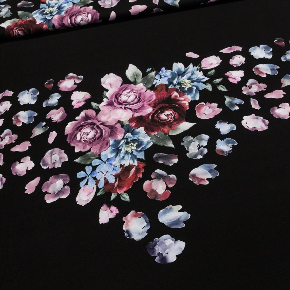 Elastický viskózový úplet (jersey) s květinovým vzorem v růžových a modrých barvách, vzor je vysoký cca 50cm a je od sebe vzdálen cca 80cm. Látka je v šířce 175 cm, vyrobena z 95% viskózy a 5% elastanu (gramáž 220g/m2). Látka má vzor z jedné strany z druhé strany je bez potisku.