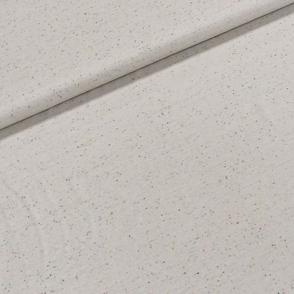 Elastický úplet (jersey) ve světle šedé barvě s barevnými nopkami barvě. Úplet je zejména vhodný na šaty, topy, kardigany, kabátky, kalhoty či sukně. Látka je v šířce 175 cm, vyrobena z 96% viskózy a 4% elastanu (gramáž 220g/m2). Látka je z obou stran stejná.