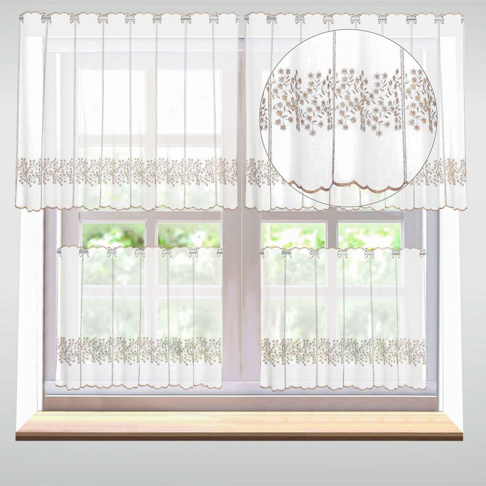 Metrážová batistová vitrážová záclona se vzorem vyšívaných béžových květinek na bílém podkladu, s bordurou. Záclona je vyrobena ze 100% polyesteru a je dostupná v různých výškách. Záclona je tkaná do panelů širokých 15cm, takže po ustřižení je již zapravená, ve vrchní části a oky na zavěšení na tyč. Výška záclony je měřena v nejdelším místě.