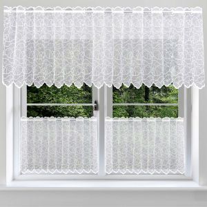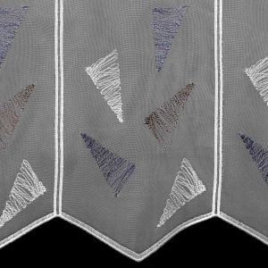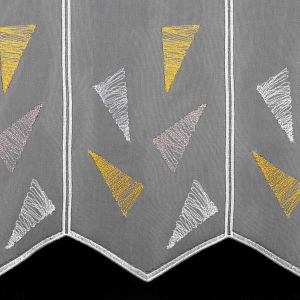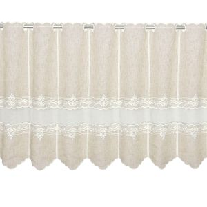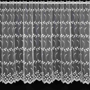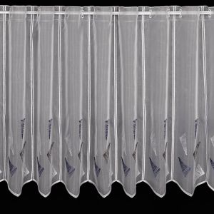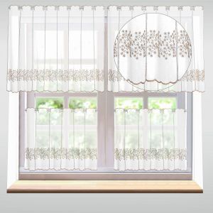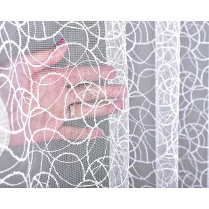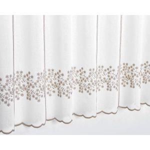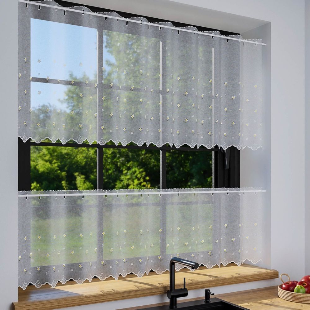 Metrážová batistová vitrážová záclona se vzorem vyšívaných květů heřmánku na bílém podkladu. Záclona je vyrobena ze 100% polyesteru a je dostupná v různých výškách ve vrchní části s oky na zavěšení na tyč. Výška záclony je měřena v nejdelším místě.