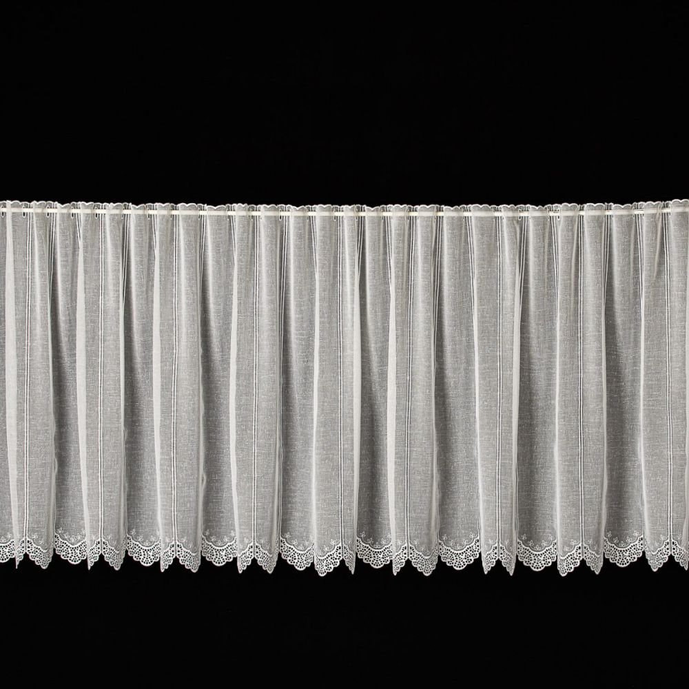 Metrážová batistová vitrážová záclona s bílými vyšívanými drobnými lístky na bílém podkladě, s bordurou zakončenou obloučky. Záclona je vyrobena ze 100% polyesteru a je dostupná v různých výškách. Výška záclony je měřena v nejdelším místě. Záclona po ustřižení je již zapravená, šířka jednoho pole je cca 15cm.