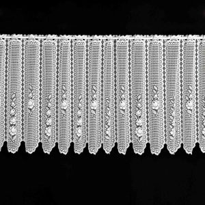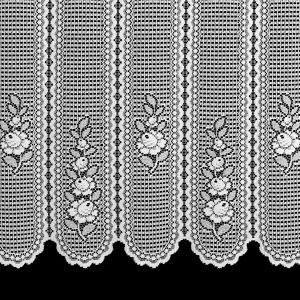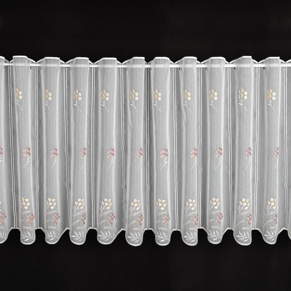 Metrážová voálová vitrážová záclona se vzorem vyšívaných květinek v měděné a světle oranžové barvě na bílé, zakončená bordurou. Záclona je vyrobena ze 100% polyesteru a je dostupná v různých výškách. Záclona je tkaná do panelů širokých cca 15cm, takže po ustřižení je již zapravená, ve vrchní části a oky na zavěšení na tyč. Výška záclony je měřena v nejdelším místě.