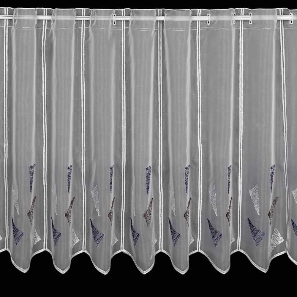Metrážová voálová vitrážová záclona se vzorem vyšívaných modrých a šedých trojúhelníků v borduře s oky na zavěšení na tyč. Záclona je vyrobena ze 100% polyesteru a je dostupná v různých výškách. Záclona je tkaná do panelů v šířce cca 15cm, po ustřižení je již zapravená. Výška záclony je měřena v nejdelším místě.