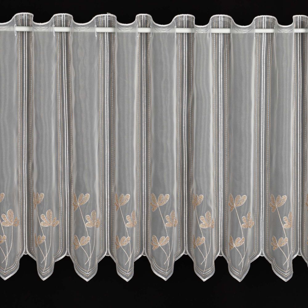 Metrážová voálová vitrážová záclona se vzorem vyšívaných béžových lístků na bílé, zakončená vlnkami a v horní části s oky na zavěšení na tyč. Záclona je vyrobena ze 100% polyesteru a je dostupná v různých výškách. Záclona je tkaná do panelů v šířce cca 13cm, po ustřižení je již zapravená. Výška záclony je měřena v nejdelším místě.