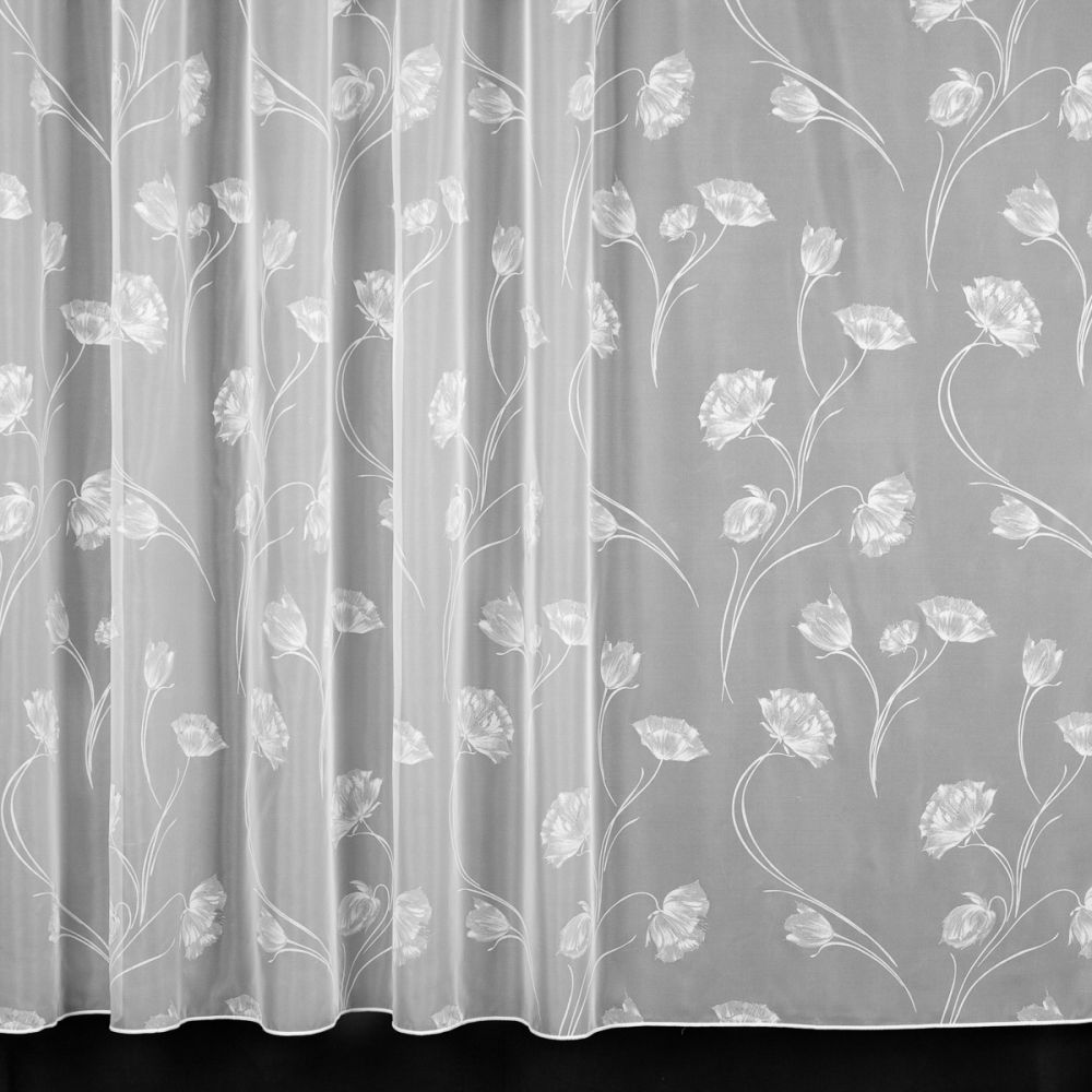 Metrážová záclona (voál) je vysoce kvalitní tkaná záclona se vzorem šedých květů vlčích máků, zakončená zátěžovým olůvkem. Záclona je vyrobena ze 100% polyesteru a je dostupná v různých výškách. Výška záclony je měřena v nejdelším místě.
