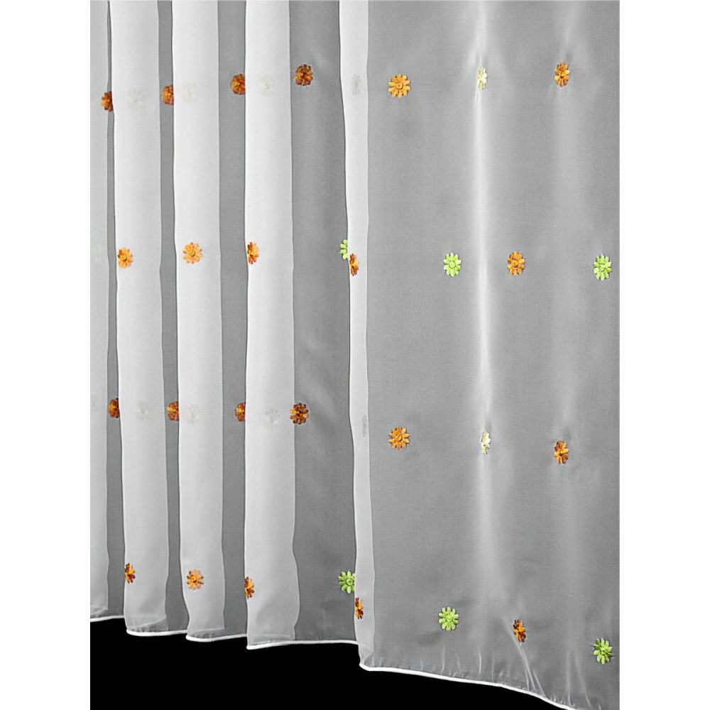 Metrážová voálová záclona v bílé barvě s vyšívanými oranžovými a zelenými květinkami, zakončená zátěžovým olůvkem Záclona je vyrobena ze 100% polyesteru a je dostupná v různých výškách. Výška záclony je měřena v nejdelším místě.