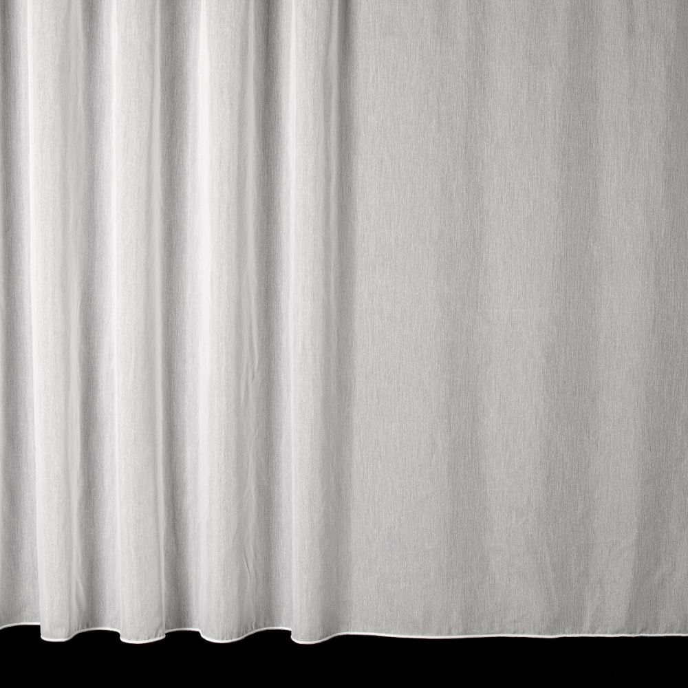 Metrážová voálová záclona s hustě tkaná v bílé barvě bez vzoru, zakončená zátěžovým olůvkem. Záclona je vyrobena ze 100% polyesteru a je dostupná v různých výškách. Výška záclony je měřena v nejdelším místě.