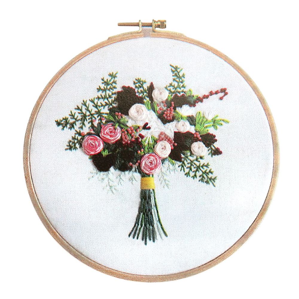 Sada na vyšívání s motivem bílo-růžové kytice. Vyšívá se na předtištěnou tkaninu pomocí příze mouline (mulinka). Vyšívací sada obsahuje vyšívací tkaninu s předlohou, sadu barevných přízí, obrázkový návod a vyšívací jehly. Rozměr samotného obrázku je 12 x 15,2 cm. Dodáváno v dárkovém balení v podobě tvrdé, papírové obálky o rozměru 15 x 22 cm. Vyšívací kruh není součástí balení. Lze použít kruhy o průměru max. cca 21 cm.