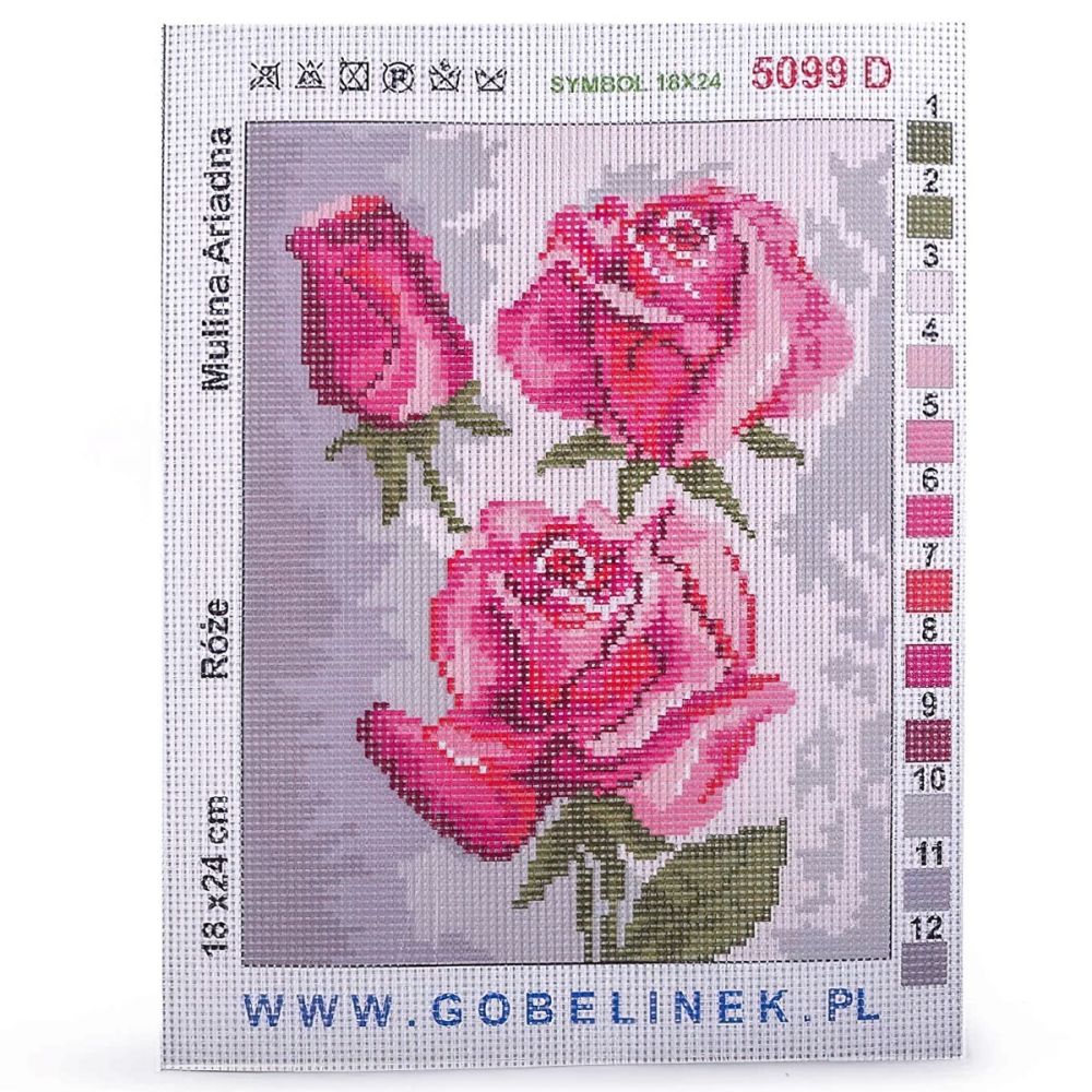 Vyšívací předloha s motivem růžových růží. Předloha na vyšívání ze 100% bavlny je vhodná zejména na křížkový steh, nejlépe při použití přízí mouline (mulinka), které na výšivce nejlépe vyniknou. Obrázek na vyšívání má rozměr 18 x 24 cm, celá předloha má obdélníkový rozměr 22,7 x 29,5 cm.
