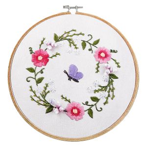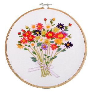 Sada na vyšívání s motivem modrých, vínových a žlutých květů na béžovém podkladu. Vyšívá se na předtištěnou tkaninu pomocí příze mouline (mulinka). Vyšívací sada obsahuje vyšívací tkaninu s předlohou, sadu barevných přízí, obrázkový návod, vyšívací jehly a dřevěný, bambusový vyšívací kruh o průměru 20,2cm, který použijete jako rámeček pro hotový obrázek.