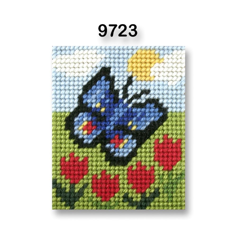 Sada na vyšívání s motivem modrého motýla a červených květin. Vyšívací sada obsahuje vyšívací tkaninu s předlohou, sadu barevných přízí a jehlu. Předloha na vyšívání ze 100% bavlny je vhodná zejména na jednoduchý steh, nejlépe při použití přízí mouline (mulinka), které na výšivce nejlépe vyniknou. Obrázek na vyšívání má rozměr 17 x 20,5 cm.