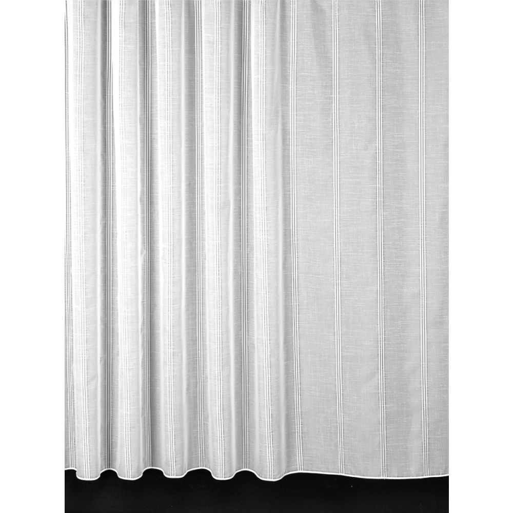 Metrážová batistová záclona s bílým motivem tří proužků na bílém podkladě, zakončená zátěžovým olůvkem. Záclona je vyrobena ze 100% polyesteru a je dostupná v různých výškách. Výška záclony je měřena v nejdelším místě.