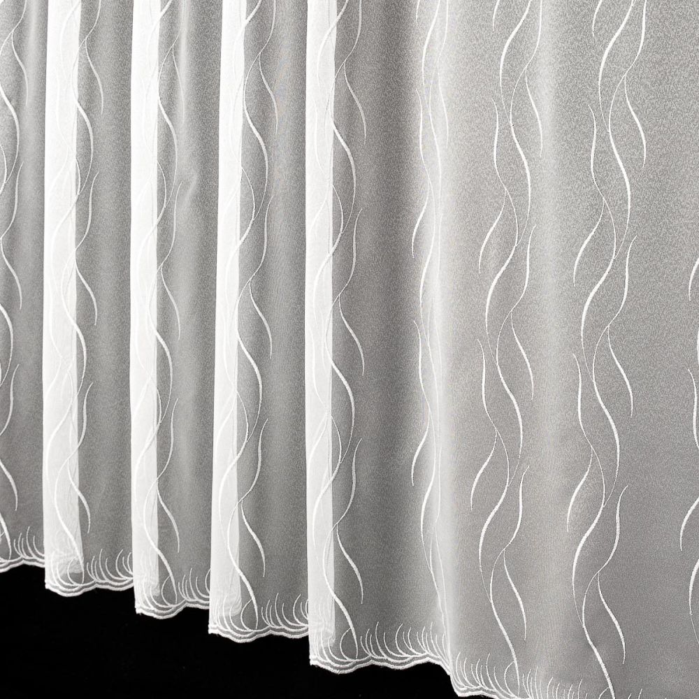 Metrážová záclona (sablé) s bílým vzorem vyšívaných svislých vlnek zakončená jemnou bordurou. Záclona je vyrobena ze 100% polyesteru a je dostupná v různých výškách. Výška záclony je měřena v nejdelším místě.