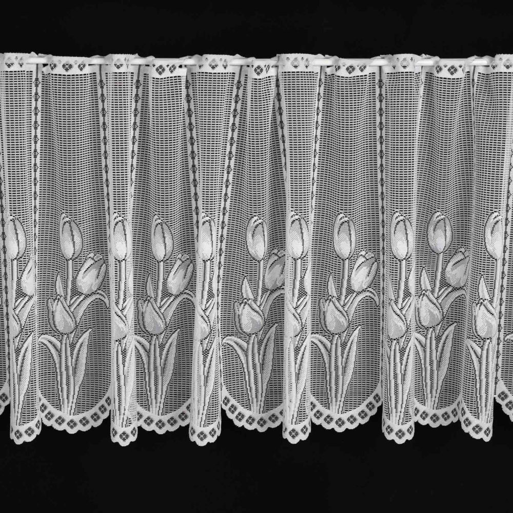 Metrážová žakárová vitrážová záclona bílá se vzorem tulipánů, zakončená bordurou. Záclona má v horní části pevný okraj s dírkami pro navlečení na tyč, tkaná do panelů cca 12cm širokých, po ustřižení je již zapravená. Záclona je vyrobena ze 100% polyesteru a je dostupná v různých výškách. Výška záclony je měřena v nejdelším místě.