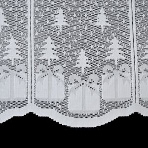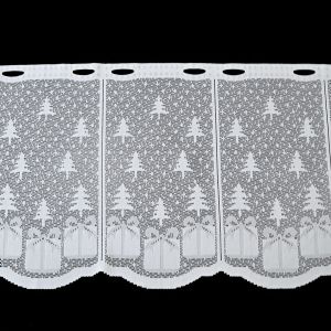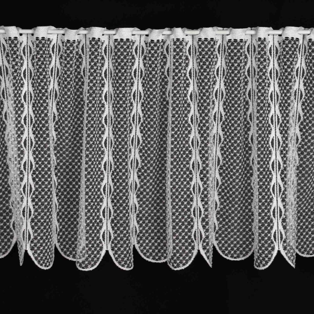 Metrážová žakárová vitrážová záclona se síťovaným vzorem v brošé provedení, zakončená obloučky. Záclona má v horní části pevný okraj s dírkami pro navlečení na tyč, tkaná do panelů cca 12cm širokých, po ustřižení je již zapravená. Záclona je vyrobena ze 100% polyesteru a je dostupná v různých výškách. Výška záclony je měřena v nejdelším místě.
