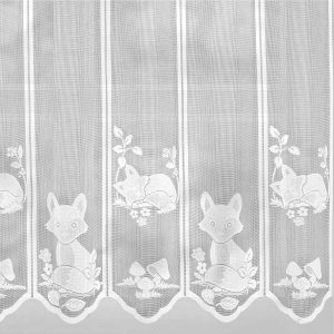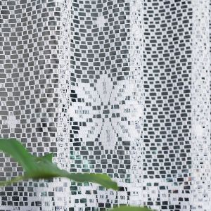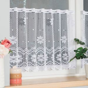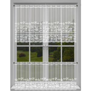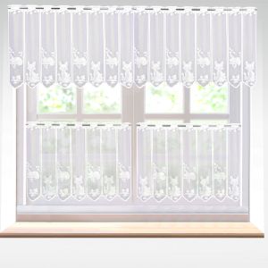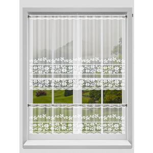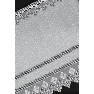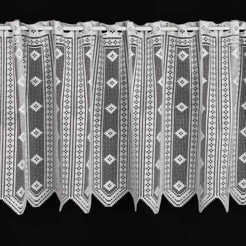 Metrážová žakárová hrubší vitrážová záclona bílá s geometrickým vzorem, zakončená špičkami. Záclona má v horní části pevný okraj s dírkami pro navlečení na tyč, tkaná do panelů cca 12cm širokých, po ustřižení je již zapravená. Záclona je vyrobena ze 100% polyesteru a je dostupná v různých výškách. Výška záclony je měřena v nejdelším místě.