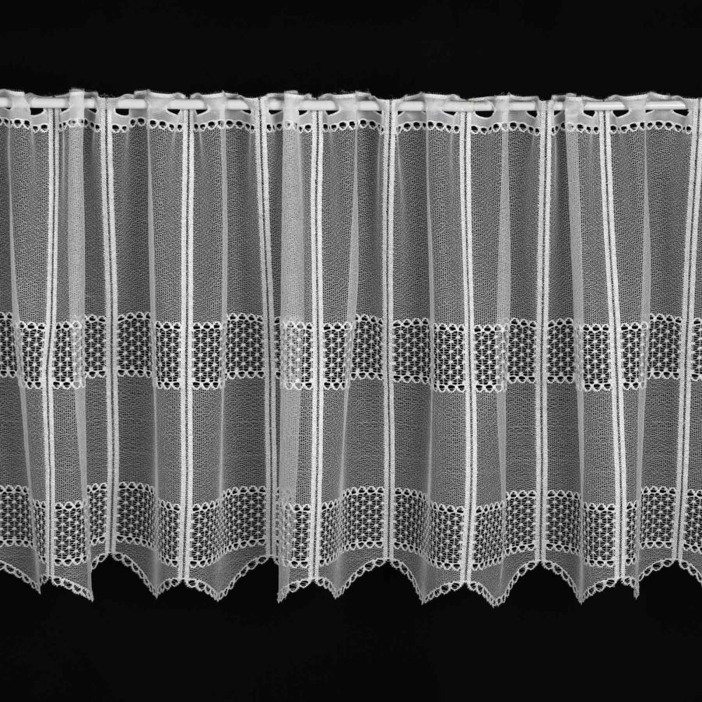 Metrážová žakárová vitrážová záclona se vzorem síťovaných proužků v brošé provedení, zakončená bordurou. Záclona má v horní části pevný okraj s dírkami pro navlečení na tyč, tkaná do panelů cca 15cm širokých, po ustřižení je již zapravená. Záclona je vyrobena ze 100% polyesteru a je dostupná v různých výškách. Výška záclony je měřena v nejdelším místě.