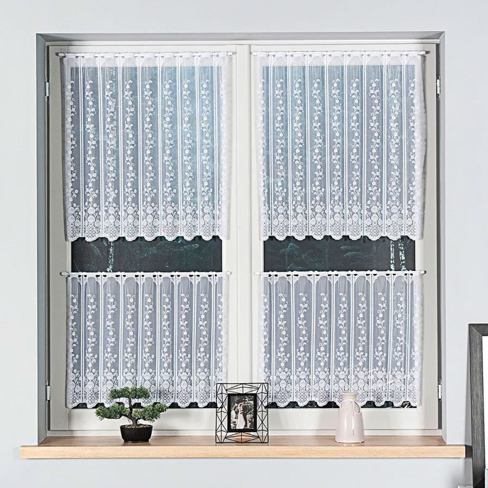 Metrážová žakarová vitrážová záclona s květinovým vzorem na bílém podkladě, s bordorou zakončenou obloučky. Záclona je vyrobena ze 100% polyesteru v a je dostupná v různých výškách. Výška záclony je měřena v nejdelším místě. Záclona po ustřižení je již zapravená, šířka jednoho pole je cca 15cm. Záclona má v horní části pevný okraj s dírkami pro navlečení na tyč a po nastřižení je záclona již zapravená.