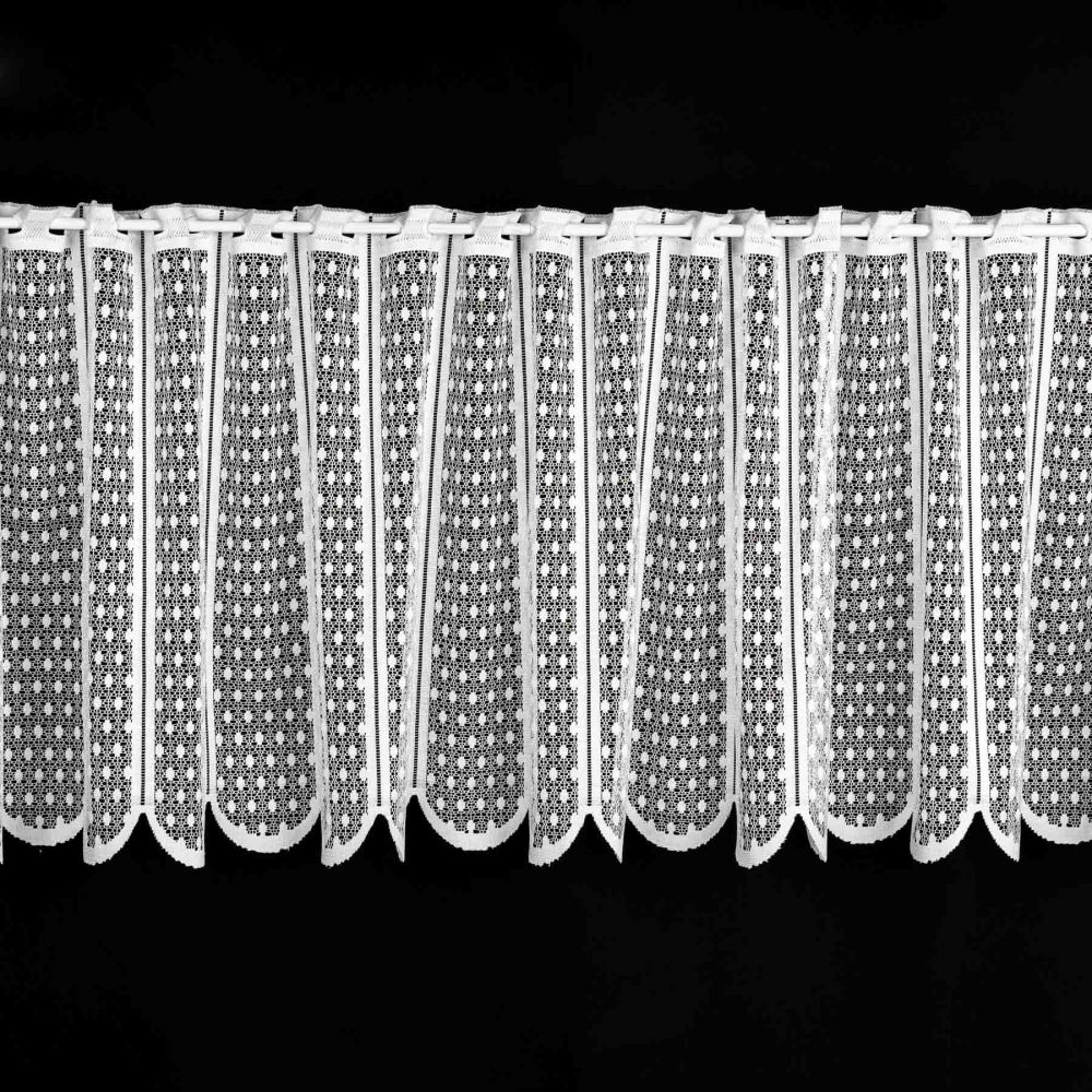 Metrážová žakárová vitrážová záclona bílá se vzorem puntíků, zakončená vlnkami. Záclona má v horní části pevný okraj s dírkami pro navlečení na tyč, tkaná do panelů cca 12cm širokých, po ustřižení je již zapravená. Záclona je vyrobena ze 100% polyesteru a je dostupná v různých výškách. Výška záclony je měřena v nejdelším místě.
