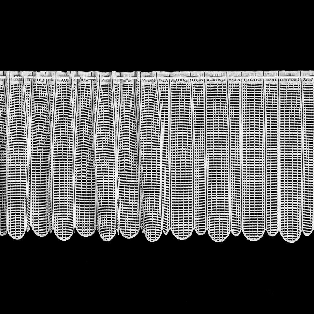 Metrážová žakárová vitrážová záclona hrubá síťovaná zakončená obloučky. Záclona je vyrobena ze 100% polyesteru a je dostupná v různých výškách. Výška záclony je měřena v nejdelším místě.