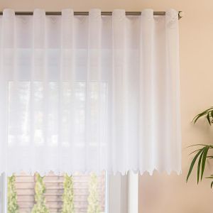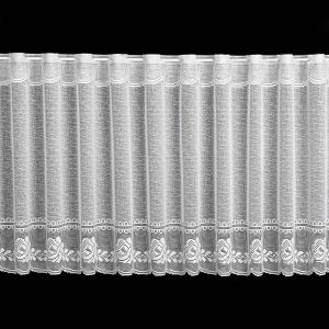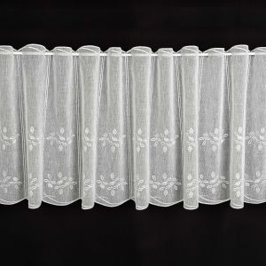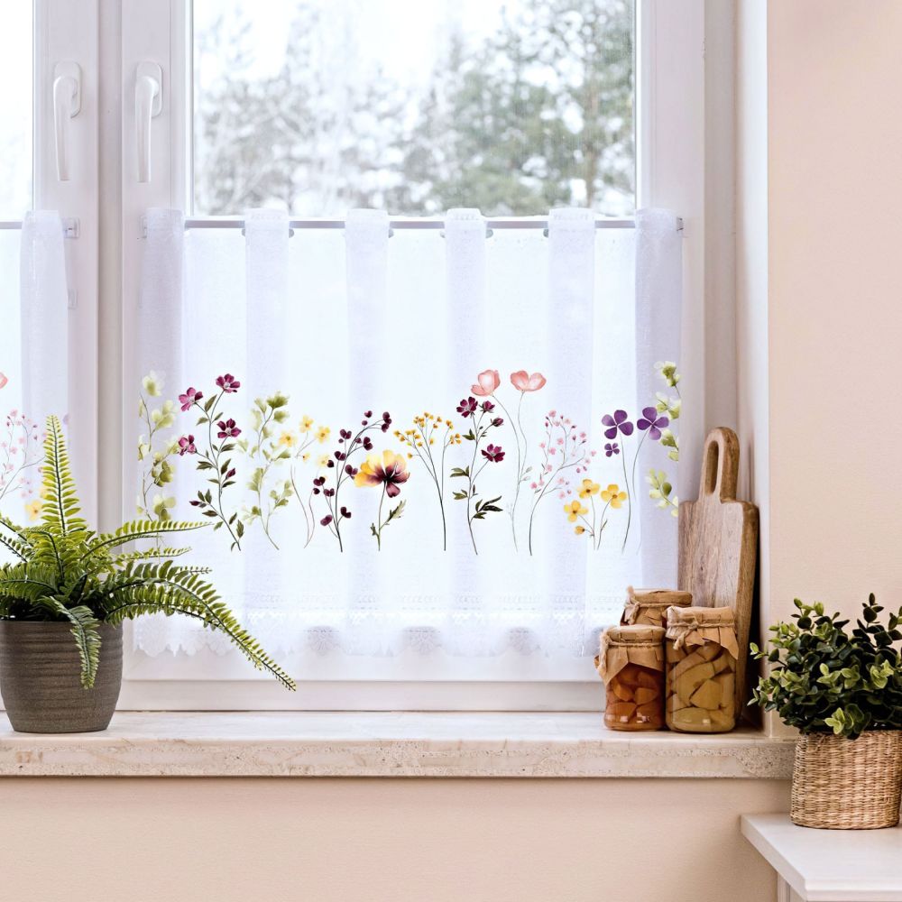 Metrážová žakárová vitrážová jemná záclona bílá s kvalitně tištěným vzorem barevných květin, zakončená obloučky. Záclona má v horní části okraj s dírkami pro navlečení na tyč. Záclona je vyrobena ze 100% polyesteru a je dostupná v různých výškách. Výška záclony je měřena v nejdelším místě.