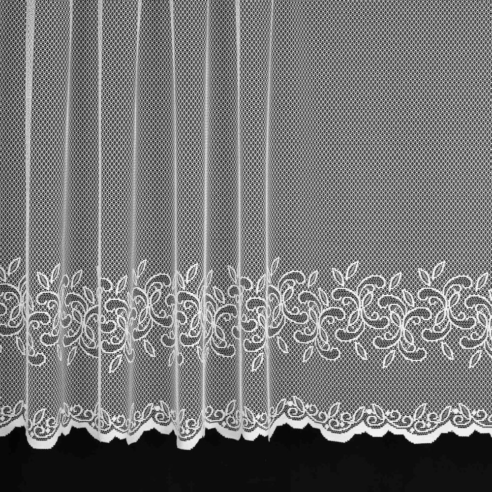 Metrážová hrubá žakárová záclona v bílé barvě se vzorem ornamentu v jedné řadě, zakončená bordurou. Záclona je vyrobena ze 100% polyesteru a je dostupná v různých výškách. Výška záclony je měřena v nejdelším místě.