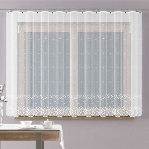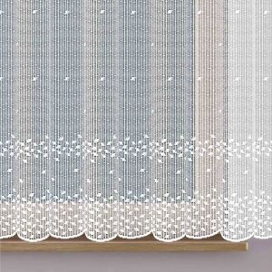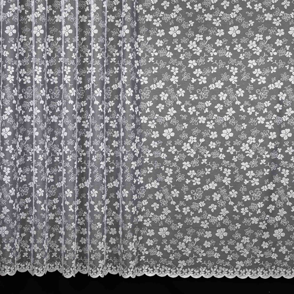Metrážová žakárová záclona v bílé barvě s celoplošným vzorem květin, zakončená vlnkami. Záclona je vyrobena ze 100% polyesteru a je dostupná v různých výškách. Výška záclony je měřena v nejdelším místě.