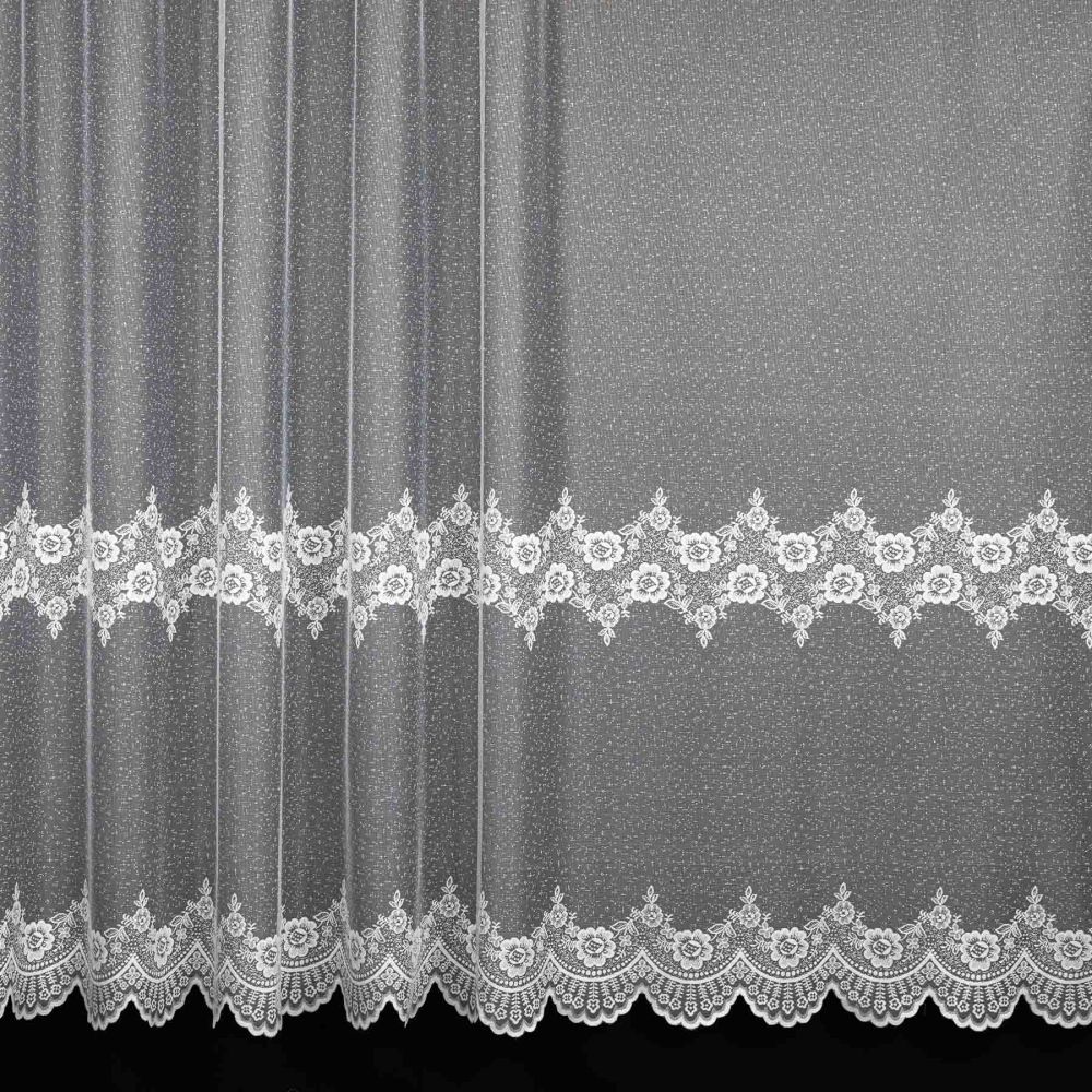 Metrážová žakárová záclona v bílé barvě se vzorem květin ve dvou řadách ve spodní části, zakončená bordurou. Záclona je vyrobena ze 100% polyesteru a je dostupná v různých výškách. Výška záclony je měřena v nejdelším místě.
