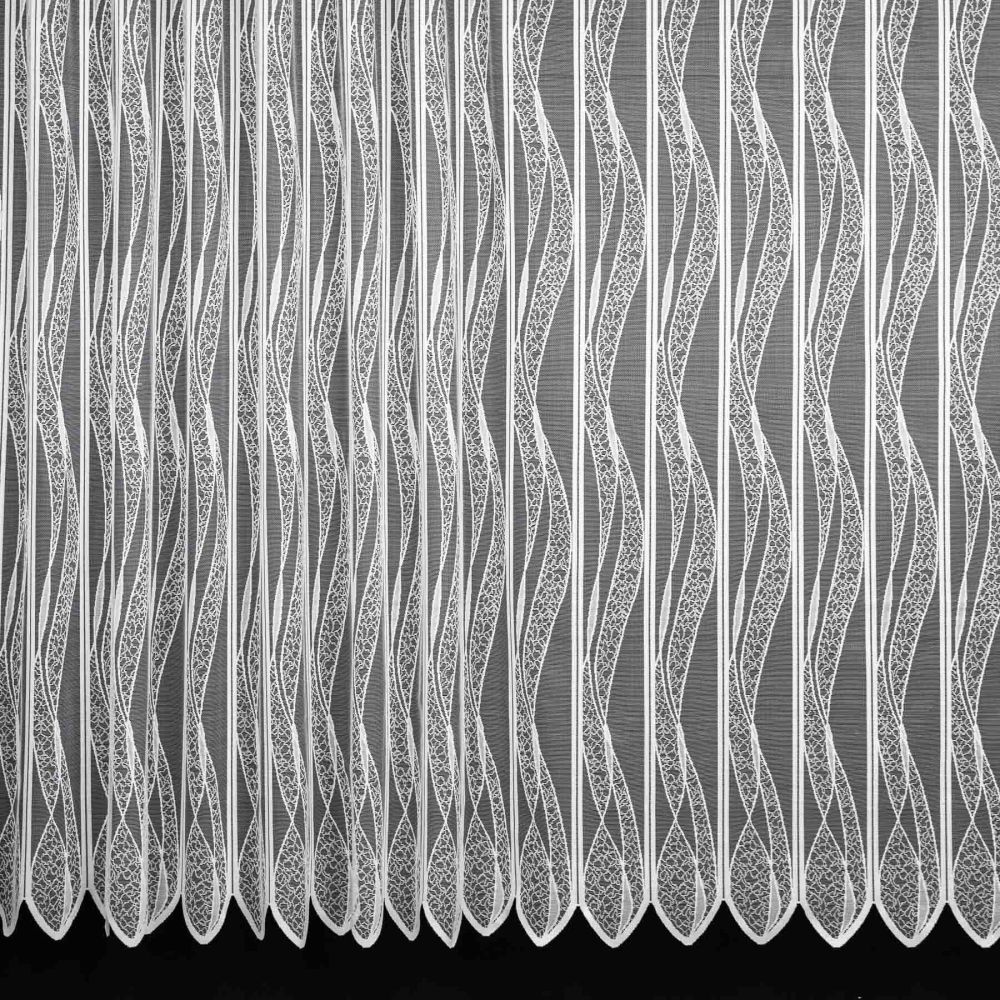 Metrážová žakárová záclona v bílé barvě se vzorem vlnek. Záclona je vyrobena ze 100% polyesteru a je dostupná v různých výškách. Záclona je tkaná do panelů cca 15cm ( po ustřižení je již záclona zapravená) a s oky na navlečení na tyč. Výška záclony je měřena v nejdelším místě.