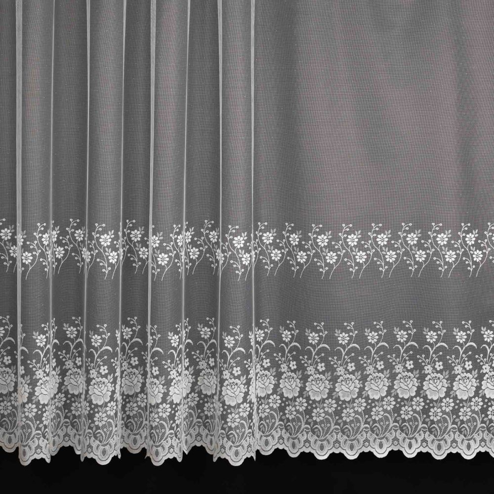 Metrážová žakárová záclona hladká v bílé barvě s květinovým vzorem ve dvou řadách, zakončená bordurou. Záclona je vyrobena ze 100% polyesteru a je dostupná v různých výškách. Výška záclony je měřena v nejdelším místě.