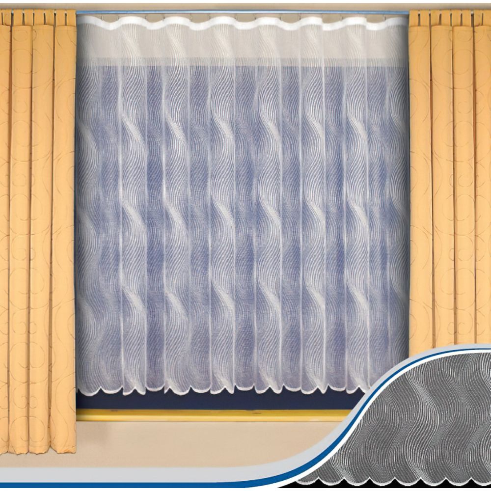 Metrážová žakárová záclona v bílé barvě s motivem vlnek, zakončená bordurou. Záclona je vyrobena ze 100% polyesteru a je dostupná v různých výškách. Výška záclony je měřena v nejdelším místě.