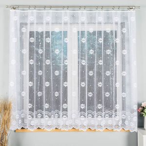 Metrážová žakárová záclona jemná v bílé barvě s motivem vzorovaných pruhů v e spodní části záclony, zakončená obloučky. Záclona je vyrobena ze 100% polyesteru a je dostupná v různých výškách. Výška záclony je měřena v nejdelším místě.