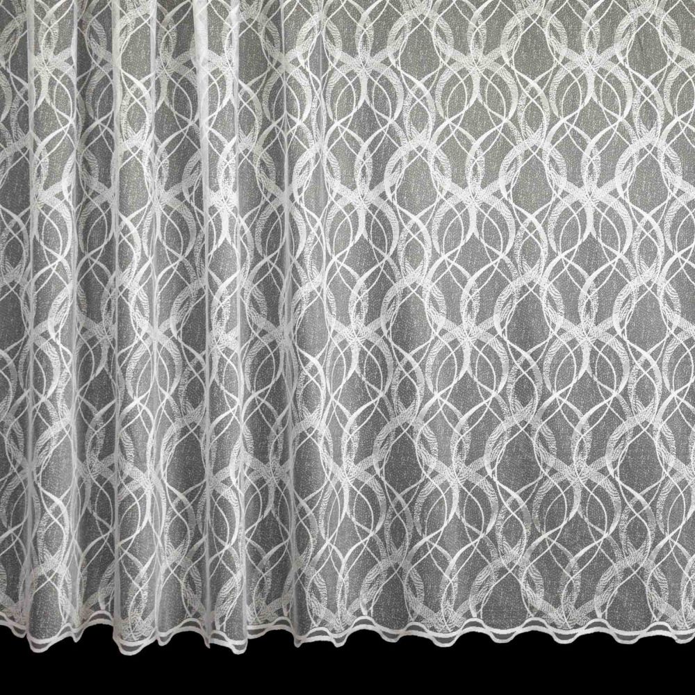 Metrážová žakárová záclona v bílé barvě s hustým vzorem překrývajících se vlnek po celé ploše, zakončená vlnkami. Záclona je vyrobena ze 100% polyesteru a je dostupná v různých výškách. Výška záclony je měřena v nejdelším místě.