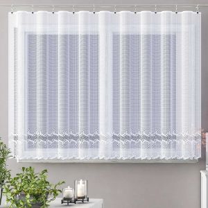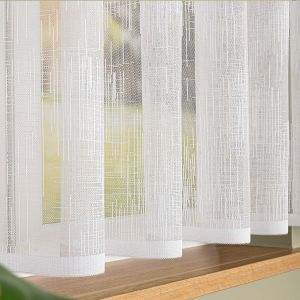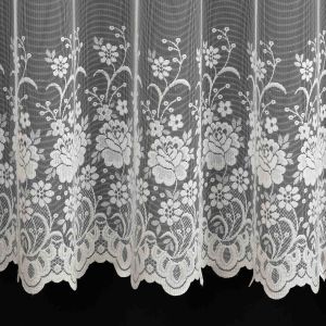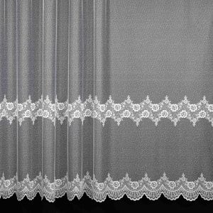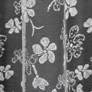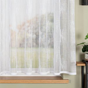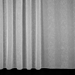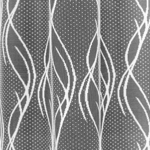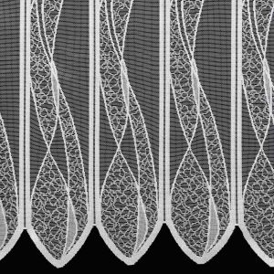 Metrážová žakárová záclona hrubší v bílé barvě se vzorem ornamentu připomínající větvičky, zakončená bordurou. Záclona je vyrobena ze 100% polyesteru a je dostupná v různých výškách. Výška záclony je měřena v nejdelším místě.