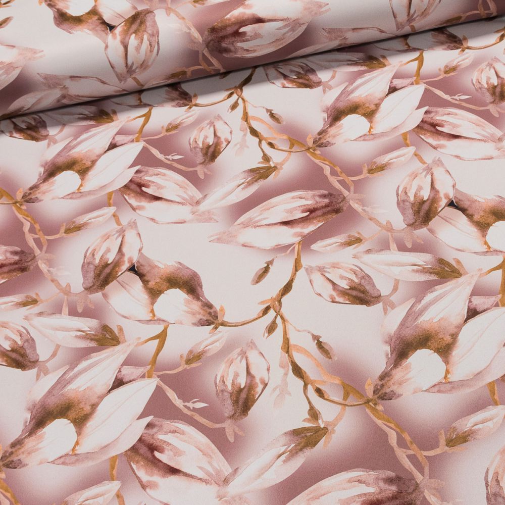 Zatemňovací neboli "blackoutová" dekorační látka s vysokou zastiňovací schopností s květinovým vzorem béžových magnolií na smetanovém podkladu. Látka na závěsy (závěsovina) je oboustranná, druhá strana je jednobarevná bílá. Zatemňovací závěsy mají mimo zastínění také termoizolační vlastnost - zabraňují úniku tepla z místnosti a tím pomáhají v létě udržet uvnitř nižší teplotu, než je venku, a v zimě naopak teplo zadržovat uvnitř a nepropouštět ven. Látka je v metráži v šířce 150cm a vyrobena ze 100% polyesteru (200 g/m2). Celkovou délku (výšku) zadejte do kolonky množství.