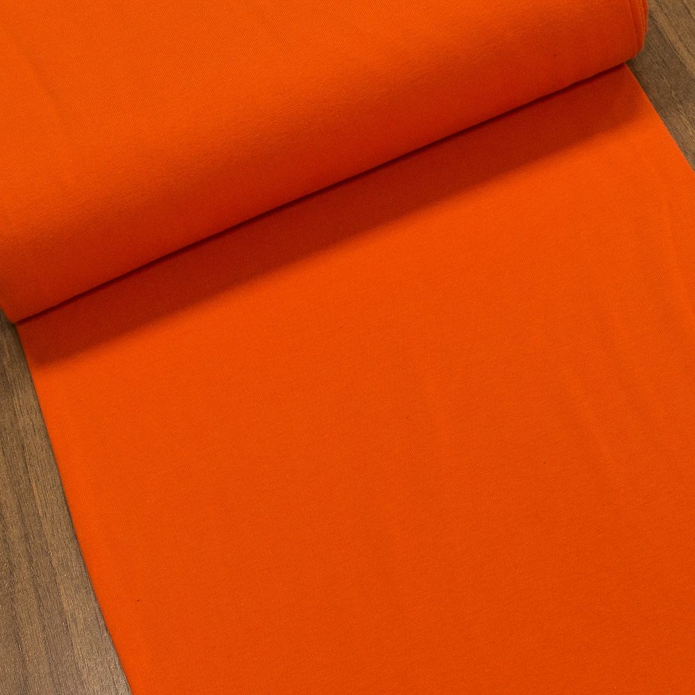 Elastický bavlněný jemně žebrovaný náplet/úplet v oranžové barvě. Jedná se o tunel s obvodem 74 cm, látka je tedy ve dvojité šířce 37 cm. Úplet je vyroben z 95% bavlny a 5% elastanu (gramáž 275g/m2) a je z obou stran stejný.
