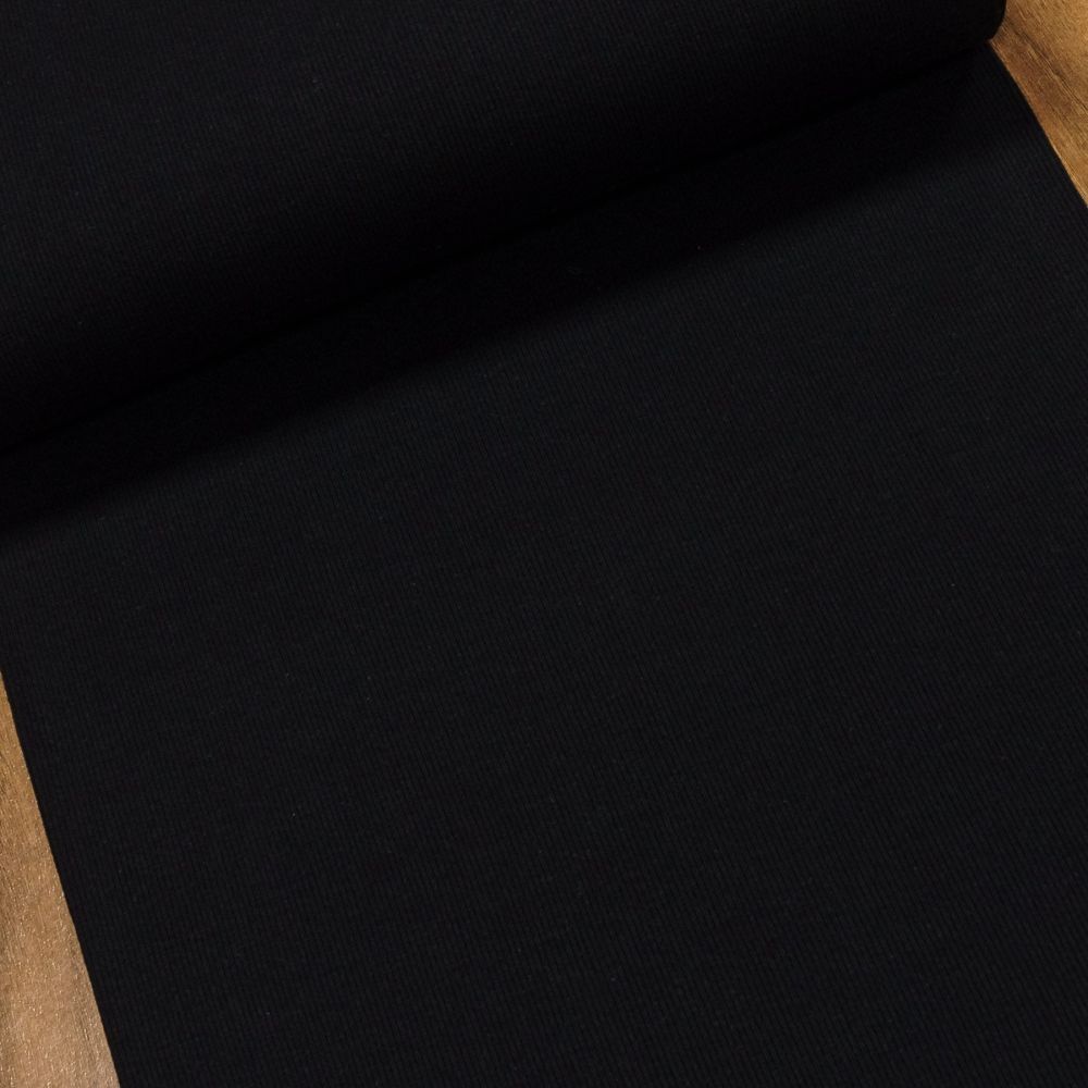Elastický bavlněný středně žebrovaný náplet/úplet jednobarevný v černé barvě. Jedná se o tunel s obvodem 74 cm, látka je tedy ve dvojité šířce 37 cm. Úplet je vyroben z 95% bavlny a 5% elastanu (gramáž 275g/m2) a je z obou stran stejný.